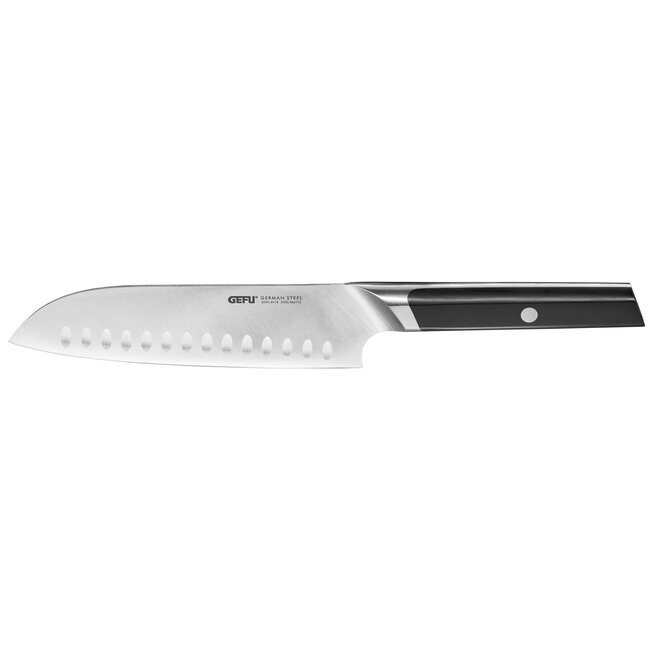 Het GEFU ACURO Santokumes is een veelzijdig keukenmes met een karakteristieke Aziatische lemmetvorm. Met het 18 cm lange lemmet en de subtiele kuiltjes (granton edge) is dit mes ideaal voor het snijden van vlees, vis en groenten, waarbij ingrediënten minder snel aan het lemmet blijven kleven.