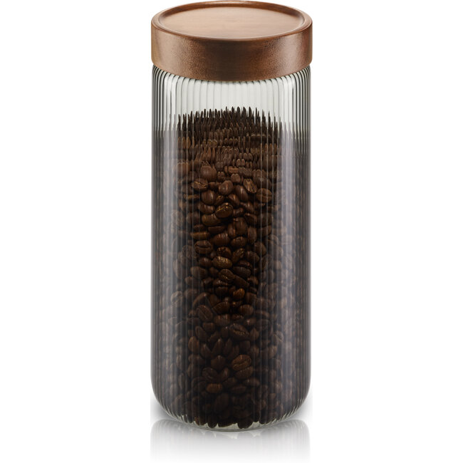 Het houten deksel is voorzien van een silicone afdichting en sluit de pot luchtdicht af, zodat aroma’s behouden blijven en de inhoud langer vers blijft. Dankzij het stevige borosilicaatglas is de voorraadpot duurzaam en geschikt voor dagelijks gebruik. De schroefdeksel is eenvoudig te verwijderen, wat vullen en reinigen extra makkelijk maakt.