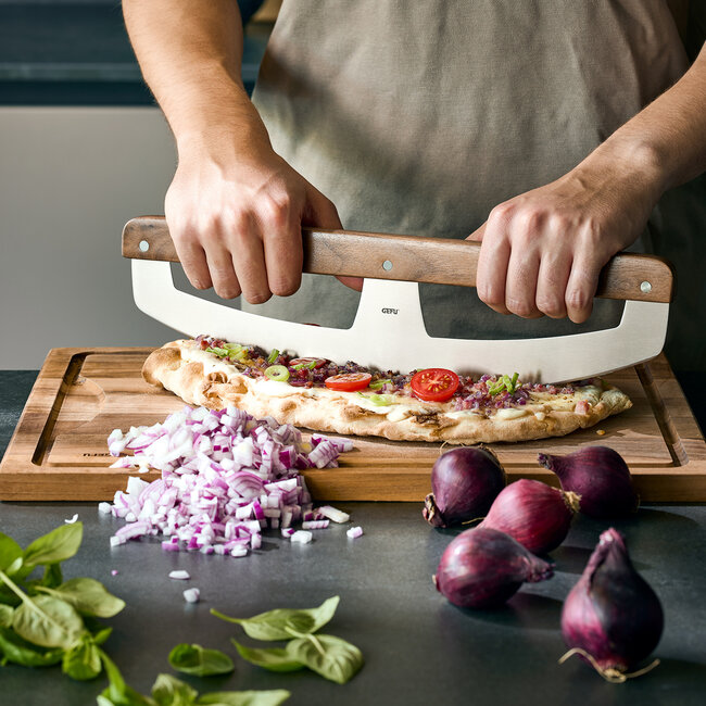Het licht gebogen roestvrijstalen mes zorgt voor een schone en gelijkmatige snede. De ergonomische handgreep van walnoothout ligt comfortabel in de hand en biedt optimale controle tijdens gebruik. Door de combinatie van functionaliteit en uitstraling is dit hakmes een sterke aanvulling binnen het GEFU-assortiment en aantrekkelijk voor zowel hobbykoks als liefhebbers van pizza en ovenproducten.